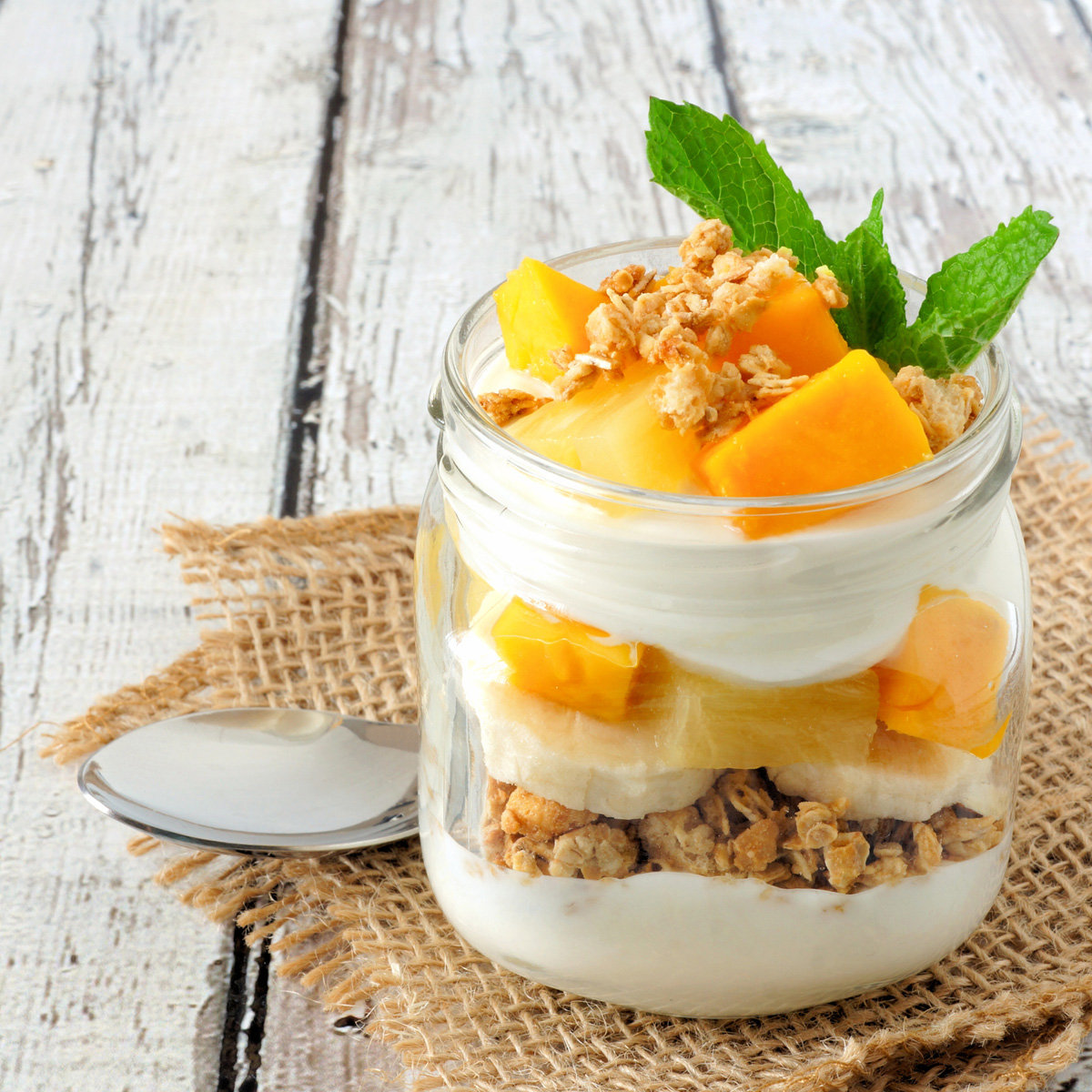 - Na vrh dodami 25 gr jogurta, posujemo s 25 g kosmičev in svežimi jagodami.